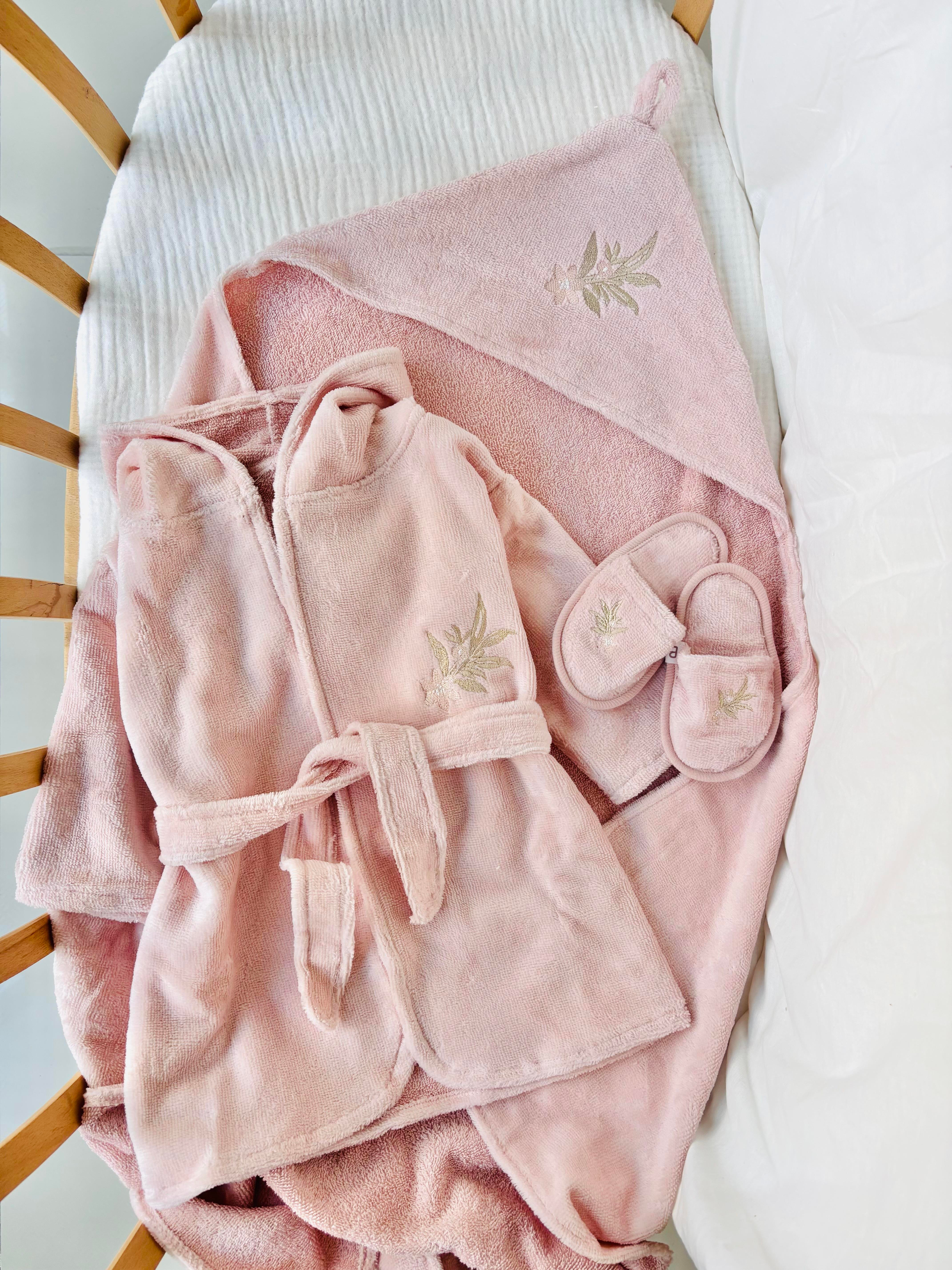 Minik prensesler için banyo sonrası zarafet! 0-12 ay bebeklere özel bu şık Pembe Yaprak İşlemeli Bornoz Takımı, banyo rutinini lüks ve narin bir deneyime dönüştürüyor. Yumuşacık dokusu ve ince işçiliği ile göz dolduruyor.