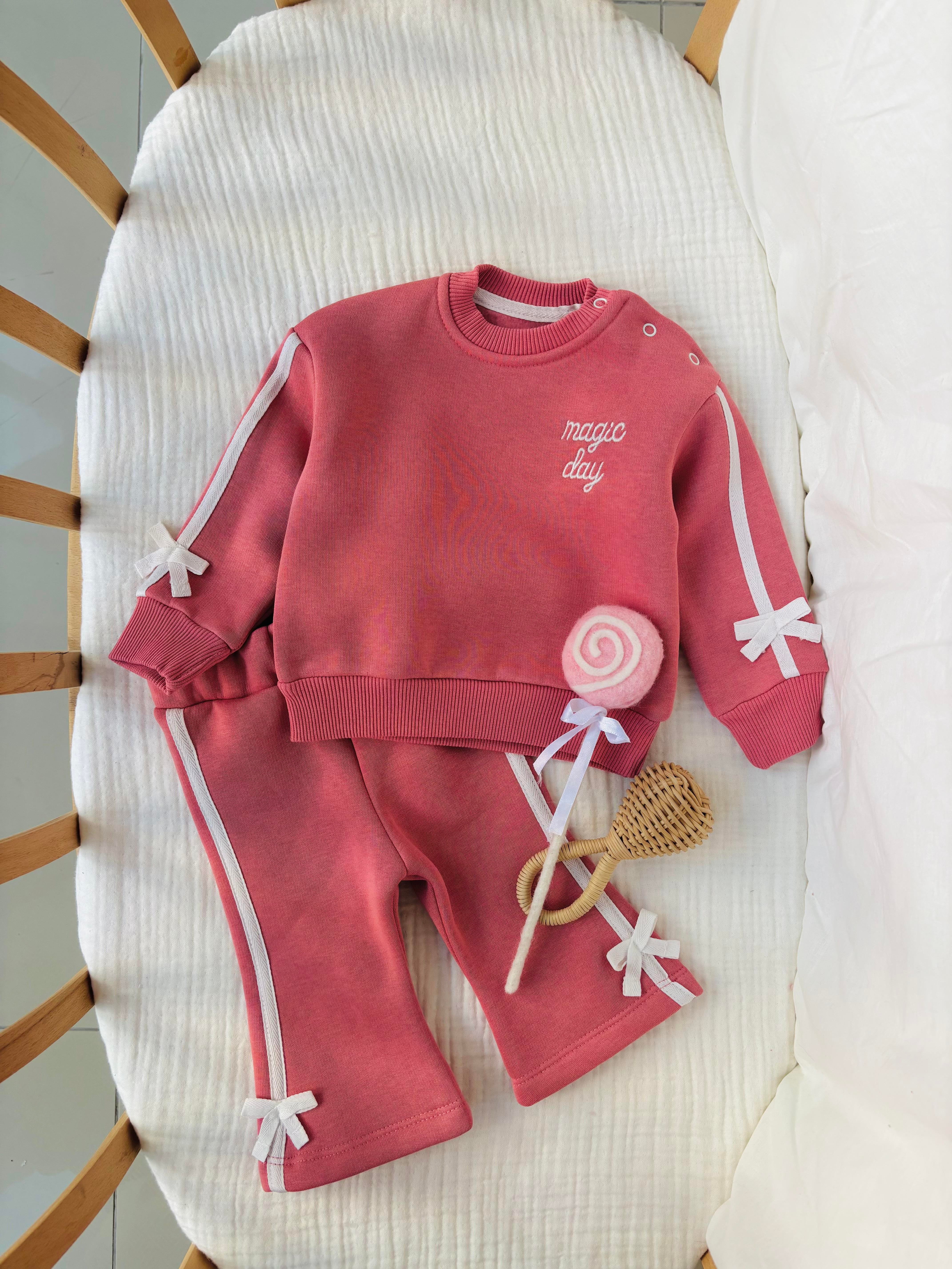 Bu 2 parçalı lüks takım, yüksek kaliteli, yumuşak kumaşları ve zarif fiyonk detaylarıyla bebeğinizin kış boyu konforlu ve şık kalmasını sağlar. Günlük kullanım, gezmeler ve özel günler için idealdir.