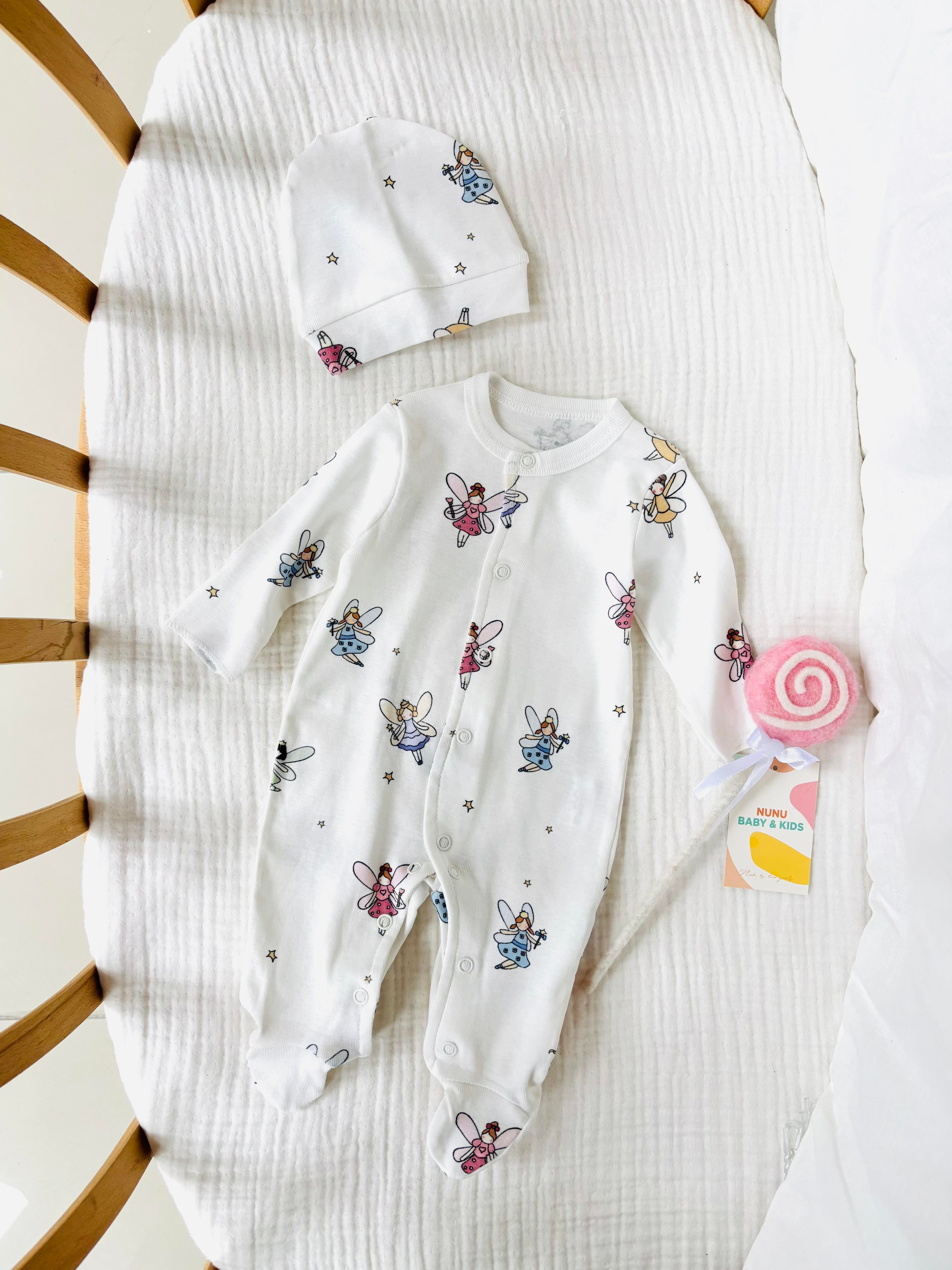 Büyülü Tasarım: Tulumun tamamında ve şapkada yer alan, renkli kanatlara sahip, neşeli peri (Pixie) figürleri ve minik yıldız baskıları, ürüne eşsiz bir sevimlilik katar.