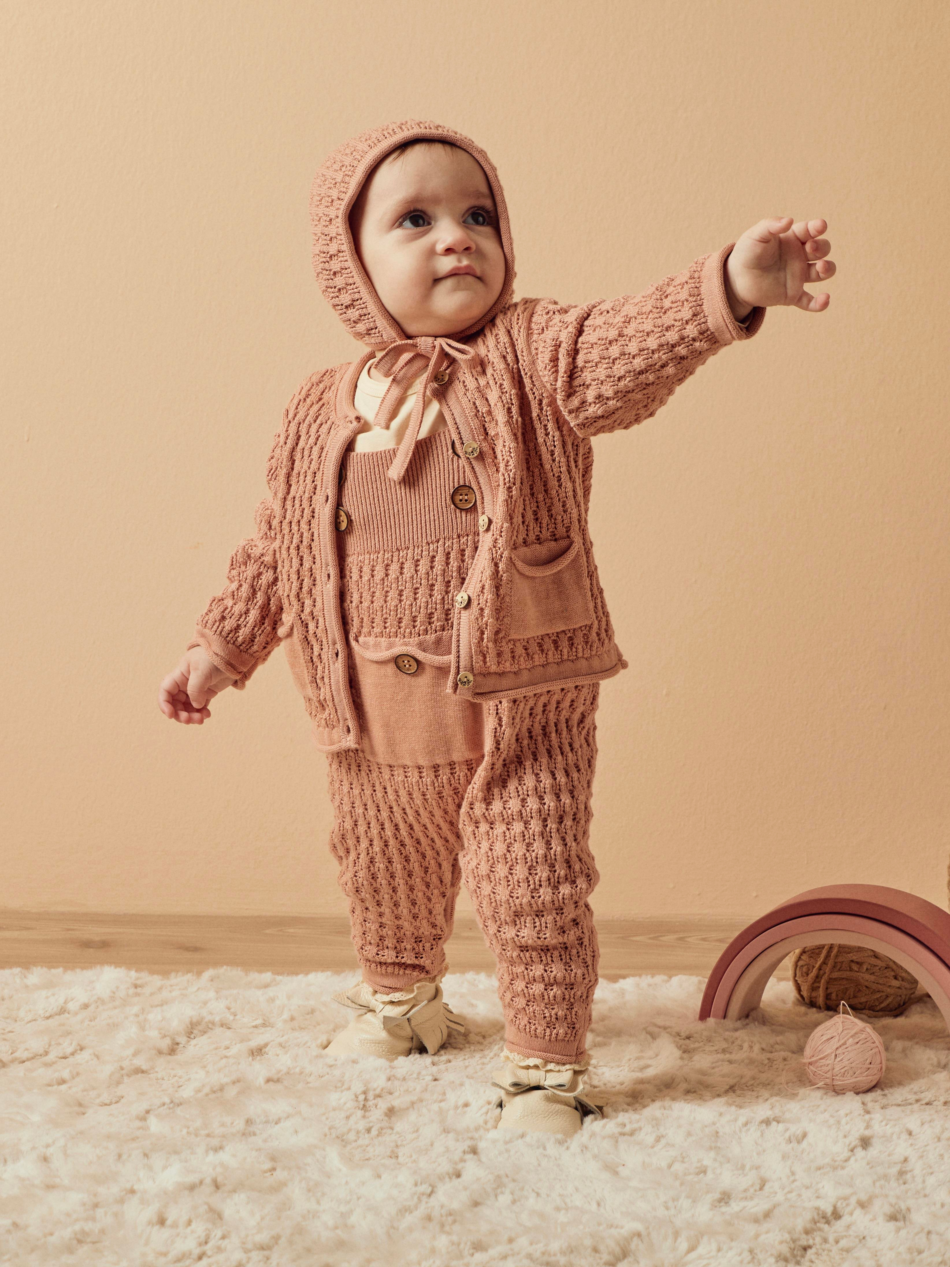 • Premium Örgü Sanatı: Ürün, seri üretimden uzak, özel örgü tekniği (bal peteği/popcorn) ile üretilmiş, hissedilir derecede yoğun ve yumuşak triko ipliğine sahiptir. Bu örgü, hem eşsiz bir estetik sunar hem de bebeğiniz için maksimum ısı yalıtımı ve nefes alabilirlik sağlar.
