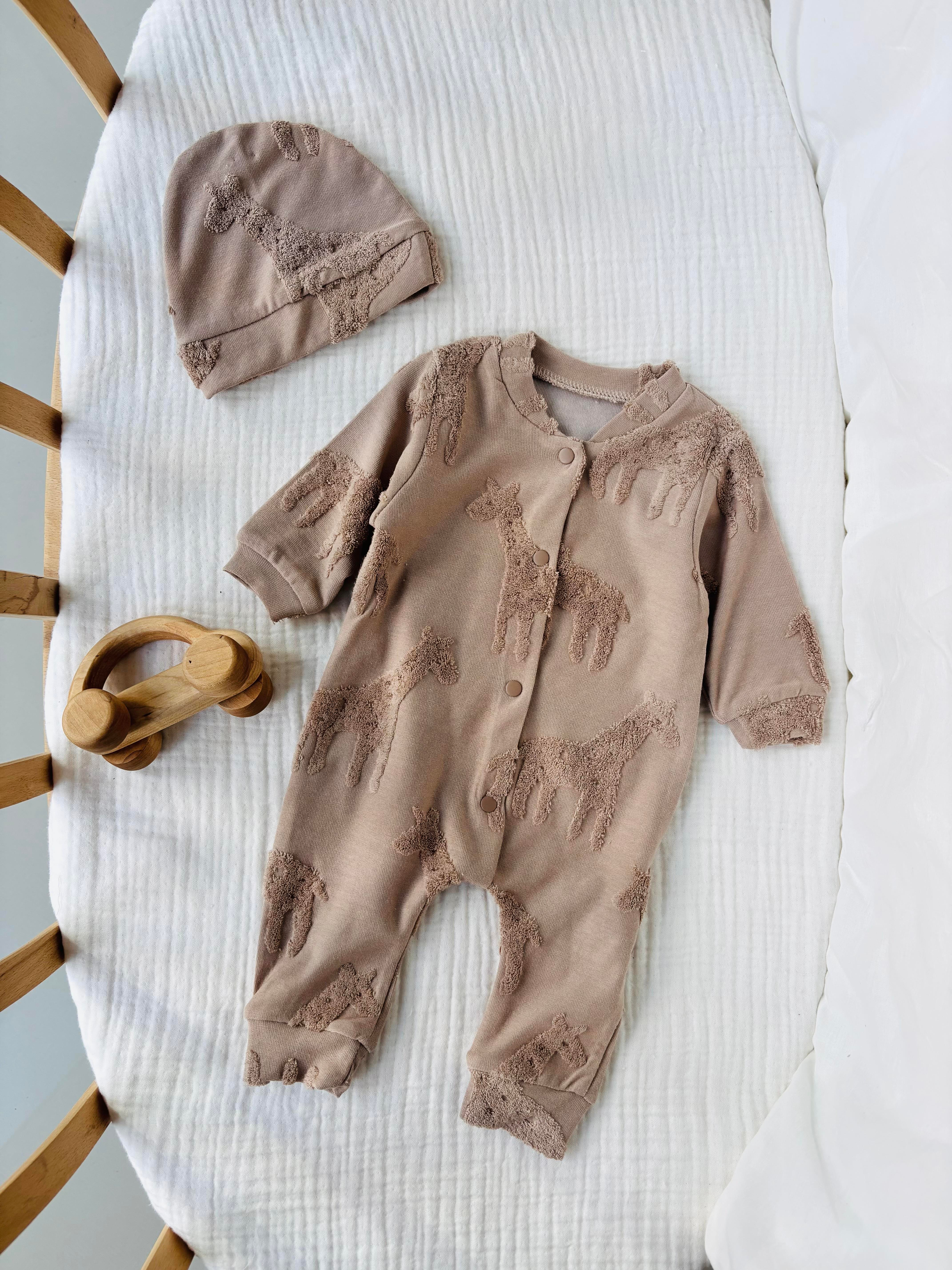 Kabartmalı zürafa deseniyle sevimli, özel dokulu kumaşıyla terletmeyen konfor! Evde ve dışarıda kullanıma uygun Zürafa Kabartmalı Şapkalı Tulum. 🦒